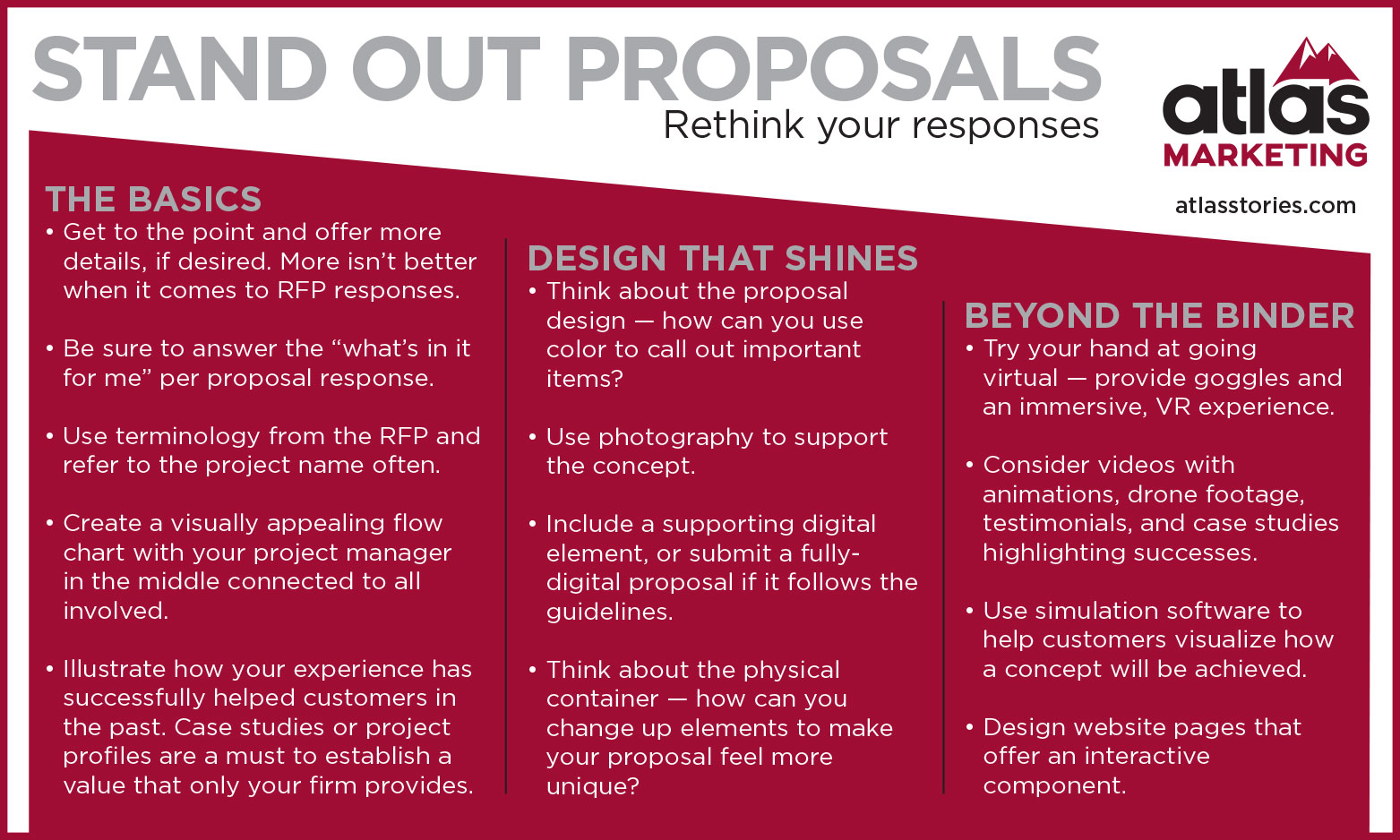 Responding to an RFP answers two questions: what your company will do to achieve the desired outcome and why a prospect should work with you over anyone else. Combining your solution (what you say) and your unique differentiator (how you say it), marks a critical step in winning new business. While an RFP response is not a traditional marketing piece, it still represents your company. Firms who utilize creativity and visual support to tell their story through RFP responses will find success.